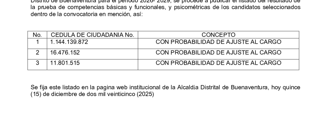 El Comité Verificador de cumplimiento de requisitos de la Alcaldía Distrital de Buenaventura, teniendo en cuenta el objetivo de transparencia que busca seleccionar a los servidores públicos partiendo de su formación, experiencia y talento y dando cumplimiento a lo establecido en la Constitución Política de Colombia, la ley 87 de 1993 modificada por la Ley 1474 de 2011, Ley 1437 de 2011, Decreto 1083 de 2015, Artículo 149 del Decreto 403 de 2020, Decreto 989 de 2020, Decreto 360 de noviembre 24 de 2025 y demás normas que regulan la materia proceden a publicar conforme al cronograma establecido en el artículo 5º del Decreto 360 de noviembre 24 de 2025 Por medio del cual se da apertura a Convocatoria No. 001 de 2025 para proveer el cargo de Jefe de Oficina de Control Interno del Nivel Central y de los Institutos Descentralizados del Distrito de Buenaventura para el periodo 2026- 2029, el listado del resultado de la prueba de competencias básicas y fucionales, y psicométricas de los candidatos seleccionados dentro de la convocatoria en mención, asi: