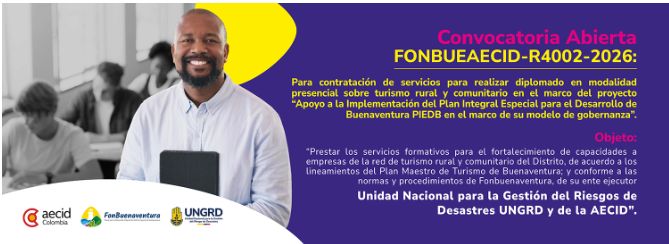 Convocatoria Abierta No. FONBUEAECID-R4002-2026, cuyo Objeto es “Prestar los servicios formativos para el fortalecimiento de capacidades a empresas de la red de turismo rural y comunitario del distrito, de acuerdo a los lineamientos del Plan Maestro de Turismo de Buenaventura; y conforme a las normas y procedimientos de Fonbuenaventura, de su ente ejecutor Unidad Nacional para la gestión del Riesgos de Desastres UNGRD y de la AECID”.