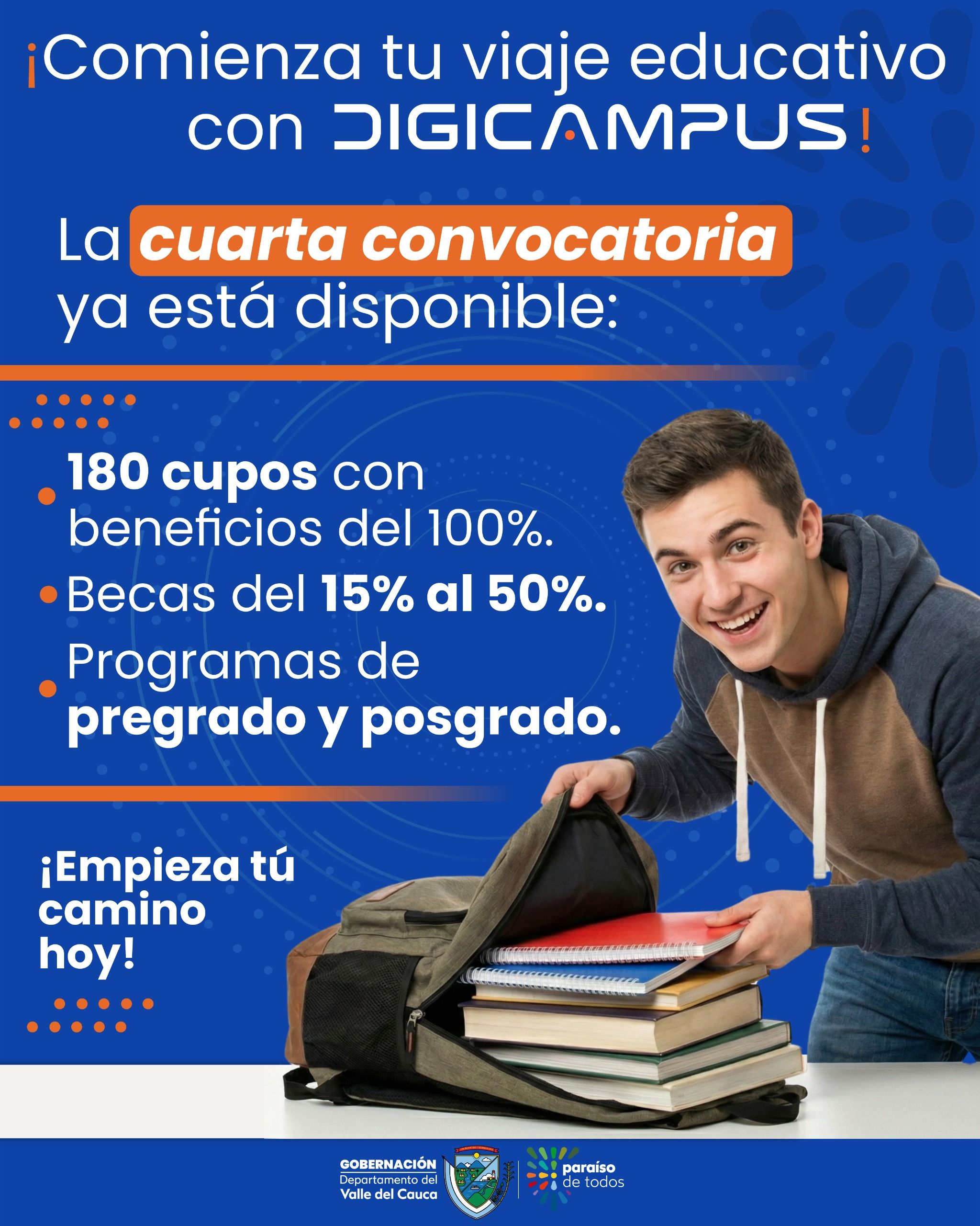 Desde la Gobernación del Valle del Cauca, a través del programa DigiCampus se permite realizar la postulación de jóvenes vallecaucanos con mejor promedio académico del ICFES, graduados en el año 2025 de grado once, a la Cuarta Convocatoria del Programa DigiCampus.
