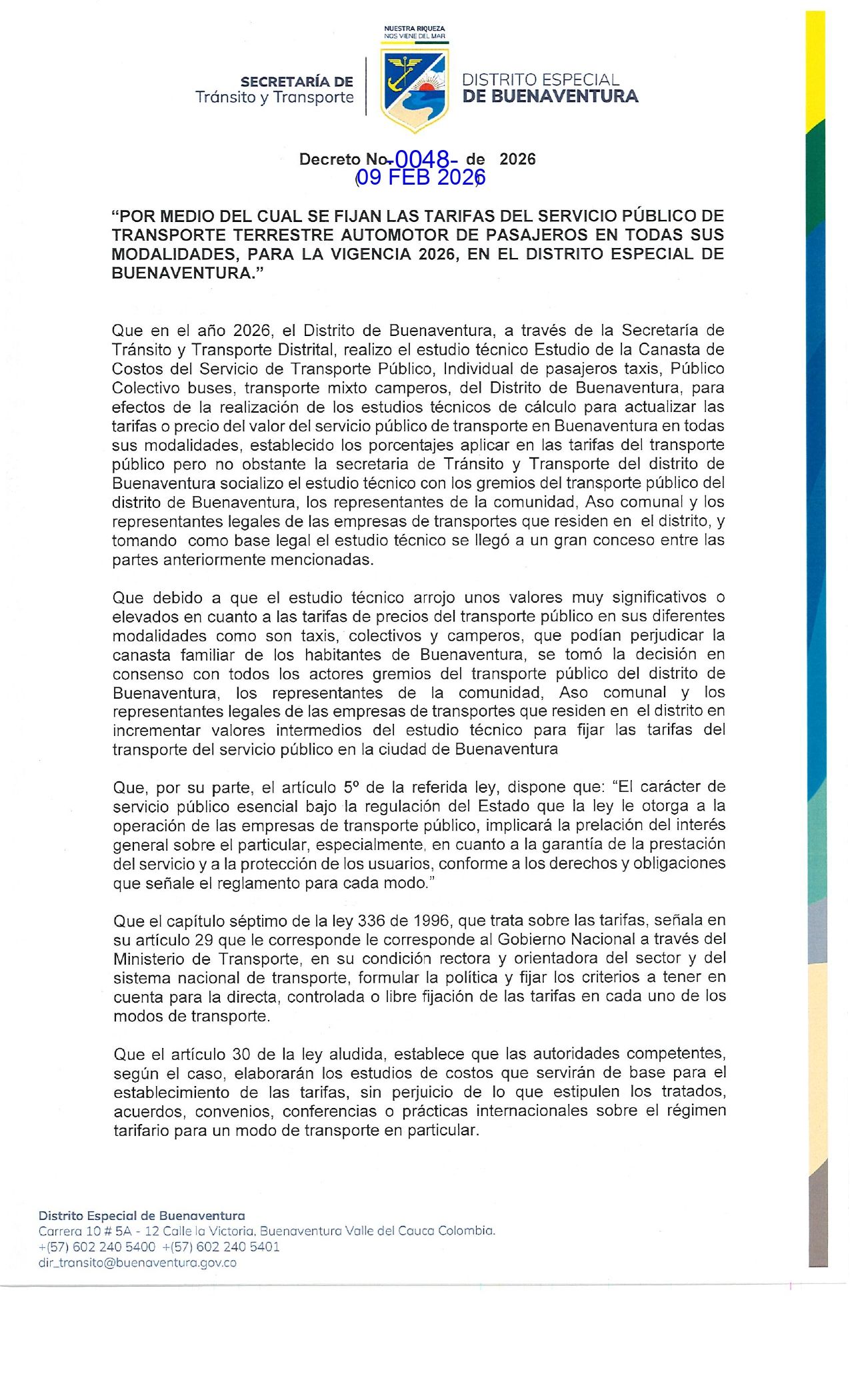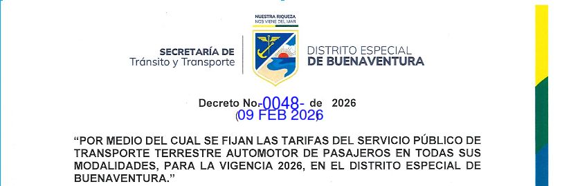 Por medio del cual se Fijan las Tarifas del Servicio Público de Transporte Terrestre Automotor de Pasajeros en todas sus modalidades, para la vigencia 2026, en el Distrito Especial de Buenaventura.