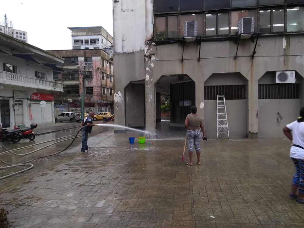 Desde tempranas horas se puedo apreciar el proceso de limpieza de la plazoleta del edificio gubernamental, para lo que se contó con el acompañamiento de un carrotanque del Cuerpo de Bomberos Voluntarios y algunas de sus unidades, quienes junto a los funcionarios de la Administración Distrital con escoba y cepillo en mano le cambiaron la cara al lugar.